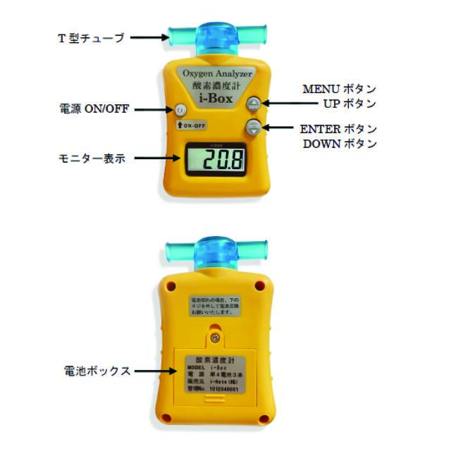 型番 i-5(VH5-B) 定格電力(W) 285W 入力電圧(V/Hz) 100V±10% 50Hz/60Hz 定格電流(A) 2.85A 濃度範囲(常温) 0.5〜5L/min時>92%, 6L/min時>85% 流量範囲(常温) 0.5〜6L/min 騒 音(dB(A))<45dB(A) 重 量(Kg) 約14.3Kg 外形寸法(mm) 330×220×504mm 付属品 酸素濃縮器本体 1台 加湿ボトル 1個 内部フィルター(円筒形) 1個 カニューラ 1本 シリコンチューブ(約50cm、半透明) 1本 外部フィルター(黒いスポンジ) 1枚 延長チューブ(約2m、透明) 1本 取扱説明書 1部 保証書(取説に添付) 1枚 酸素濃度計 i-Box サイズ122×78×40mm; 重量175グラム; 測定範囲 0-100%; 精度±2%(0-100%); 表示デジタル LCD; 表示分解能0.10%; 直線性±2%フルスケール; (圧力、温度、湿度一定条件); 使用環境0〜40℃、湿度0%〜95%RH; 気圧75〜125kPa; 保存温度-20℃〜50℃; 電池アルカリ単4電池 3本; センサーガルバニ電池式; センサー期待寿命大気中(酸素濃度20.8%の環境下)で3年間、酸素濃度100%の環境下で最大1年間; 校正方法大気自動校正。